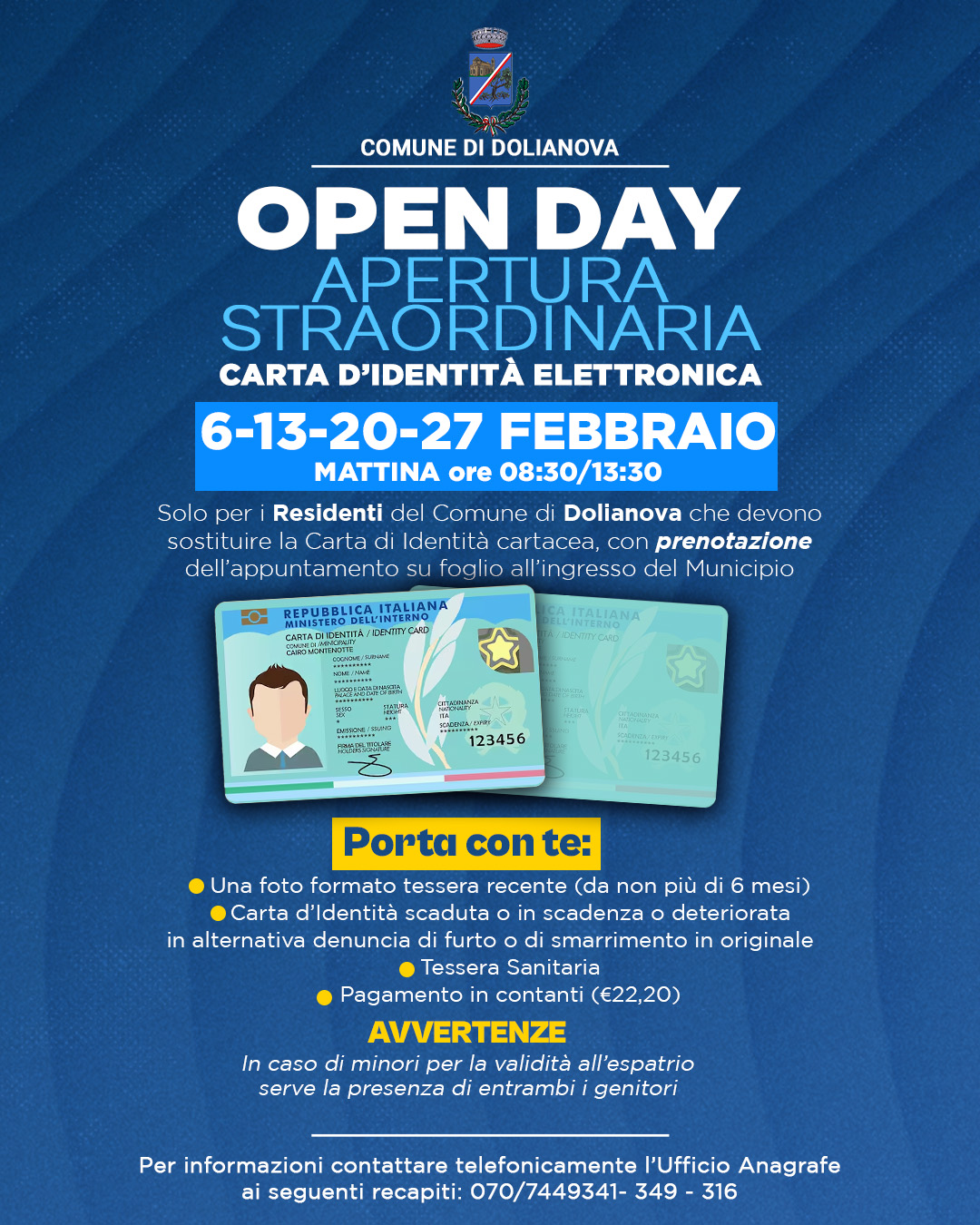 Solo per i Residenti del Comune di Dolianova che devono sostituire la Carta di Identità cartacea, con prenotazione dell’appuntamento su foglio all’ingresso del Municipio