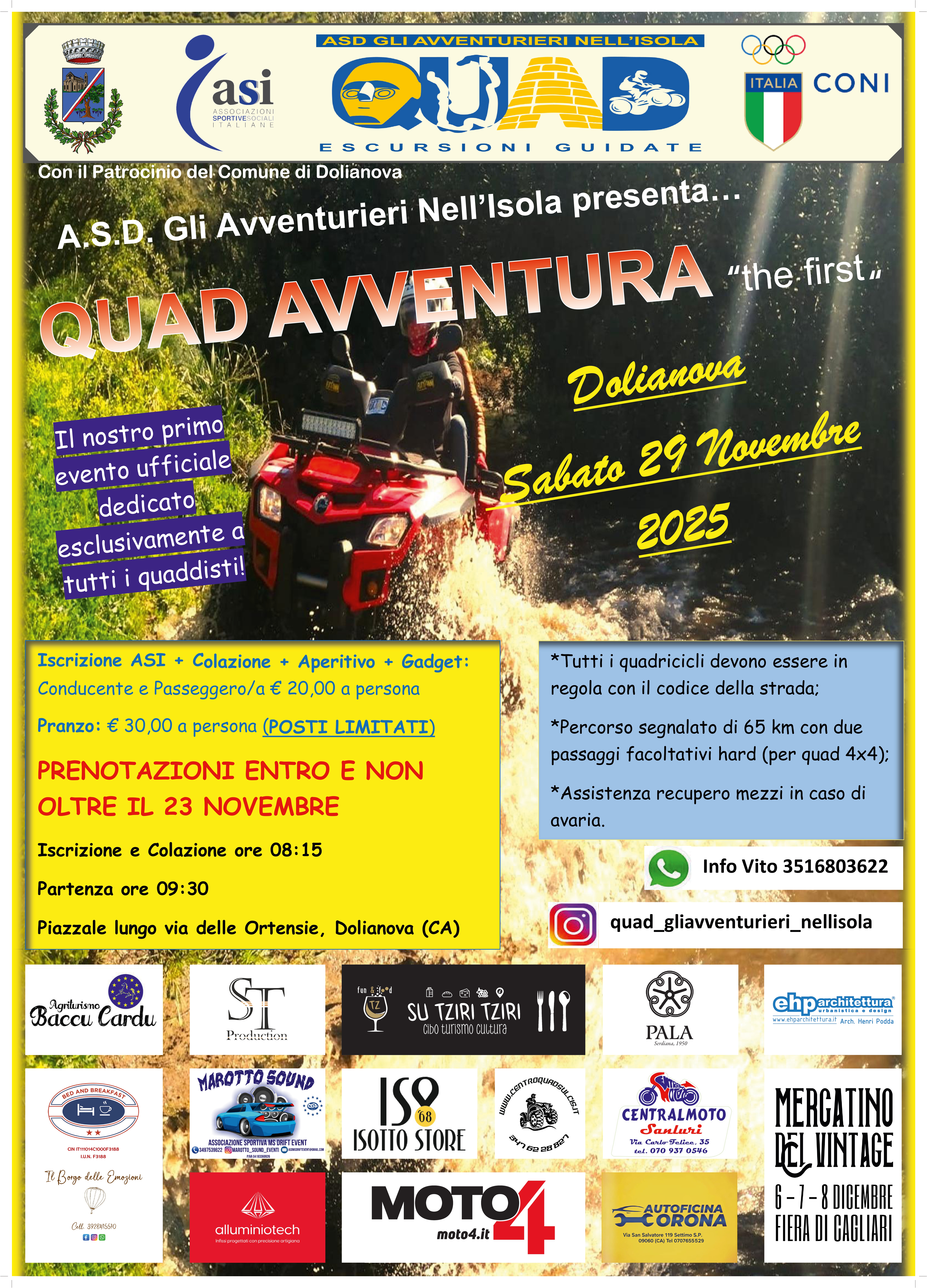 L’A.S.D. Gli Avventurieri Nell’Isola organizza la manifestazione sportiva Quad Avventura “The First”, un corteo escursionistico nell’entroterra Doliense per Quaddisti con mezzo proprio.