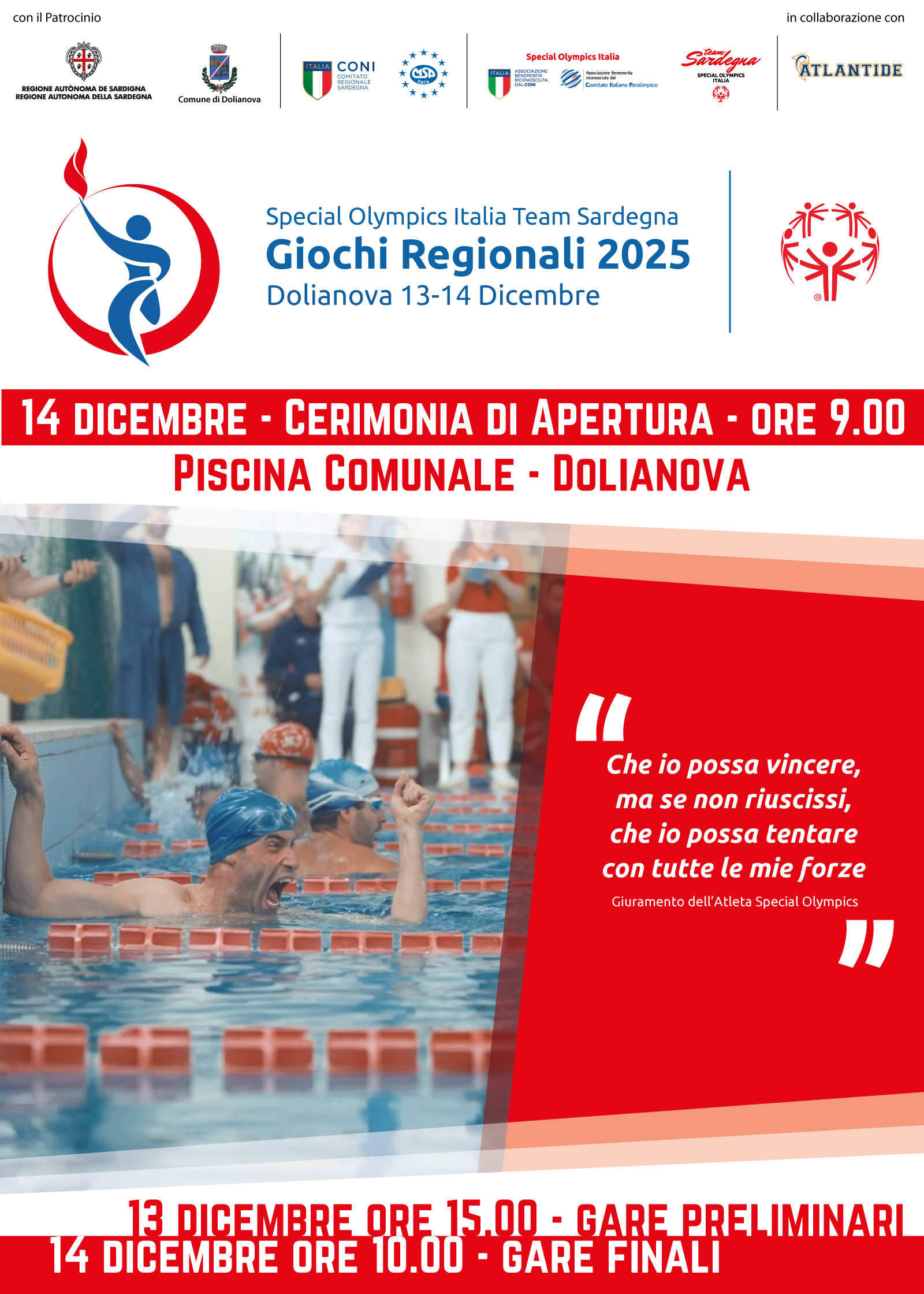 L’A.S.D. Team Sardegna con il patrocinio del Comune di Dolianova, della regione Sardegna, del CONI Sardegna, dell’MSP Sardegna e Atlantide organizza l’evento “Giochi Regionali di Nuoto Special Olympics Italia”, manifestazione sportiva di nuoto che coinvolge atleti da tutta la Sardegna e varie regioni d’Italia.